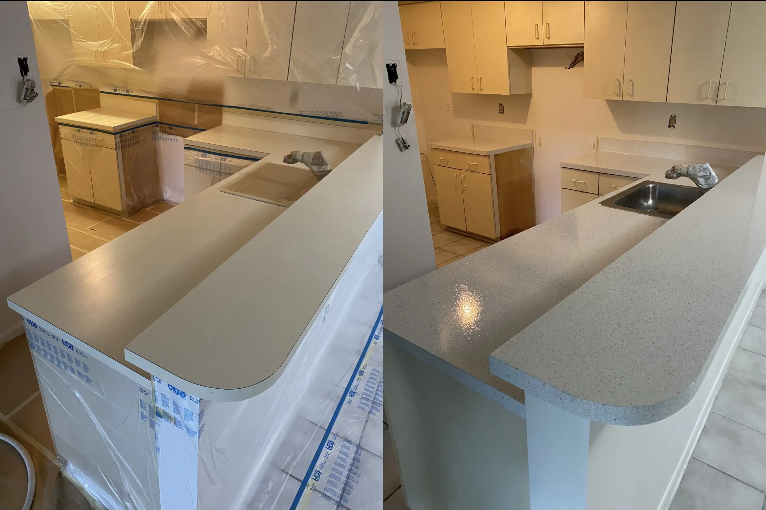 Countertop refinishing — transformed a dull, worn surface into a smooth, modern, and durable finish that enhances the entire kitchen.
