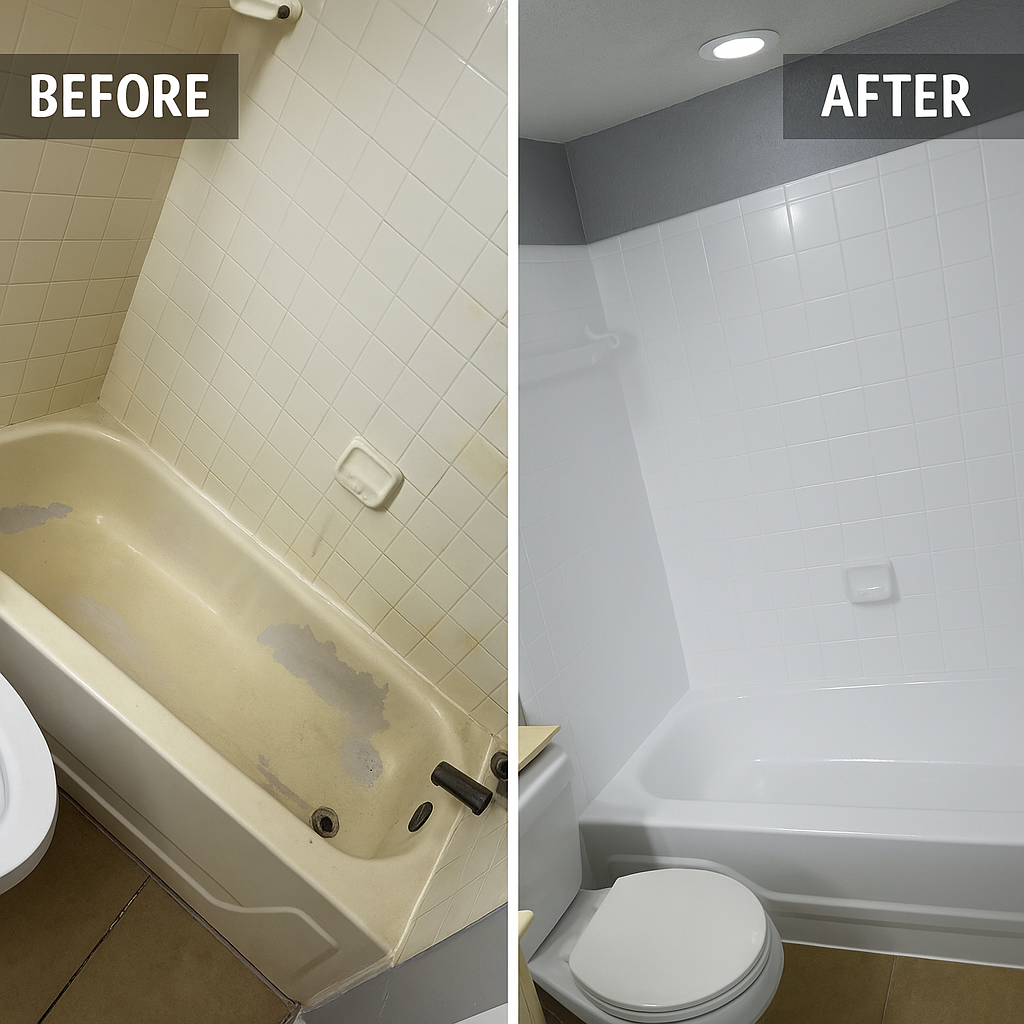 Complete bathtub and wall refinishing — transformed an aged, stained surface into a clean, bright, and modern look.